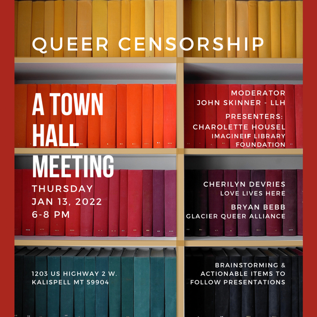 You can also attend the town hall meeting that Glacier Queer Alliance and Love Lives Here are hosting from 6-8 pm on Thursday, January 13 at the Gateway Community Center at 1203 US Highway 2 in Kalispell. Charlotte Housel from the ImagineIF Library Foundation will be a featured speaker. We’re meeting in theThe Gathering Space, which is accessible from the northeast side of The Gateway Community Center.
